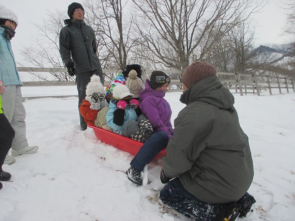 八千代牧場で雪の中ロングコースのソリ滑りを楽しんだり、夜は室内で大根抜きなどの身体を使ったゲームをして遊びますよ。