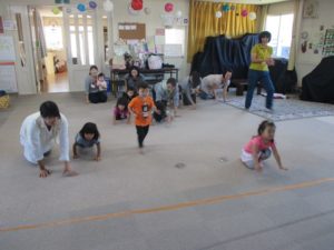 今回はハイハイ競争や玉入れ、リズム遊びなど、親子でからだを動かして楽しめるあそびを企画しました。